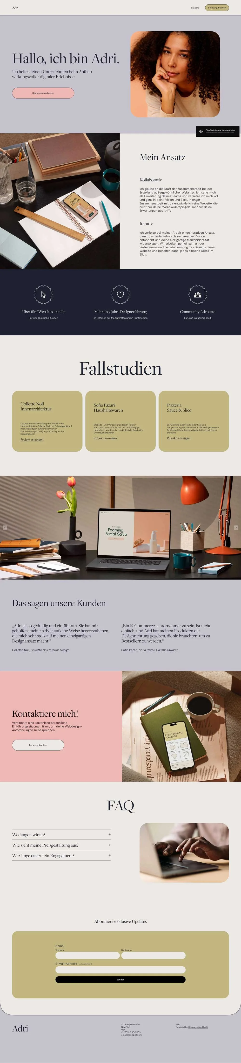 Als Squarespace Webdesigner konzipiere ich strategische und benutzerfreundliche Websites, die perfekt auf deine Ziele abgestimmt sind. Ob Website, Salespage, Onlinekurse oder ein Buchungssystem – ich helfe dir, deine Online-Präsenz professionell zu gestalten und für SEO zu optimieren. Mehr zu Webdesign.
